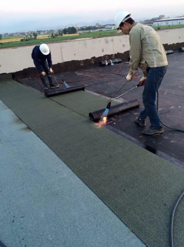 – Trải màng chống thấm, dùng máy khò đốt nóng màng chống thấm cho nóng chảy ra và ấn dính xuống bề mặt thi công.